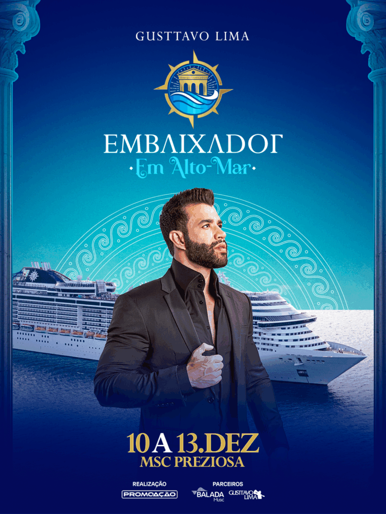 O navio mais aguardado pelos fãs enfim saiu do papel e vai acontecer! Pela primeira vez em alto mar, o Navio Embaixador em Alto Mar vem para fazer história! Com 2 shows exclusivos e convidados especiais, o cantor Gusttavo Lima promete dias inesquecíveis em alto mar.