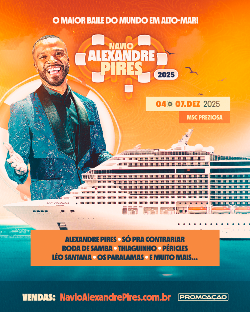 O maior baile do mundo em alto mar está de volta! O Navio Alexandre Pires chega proporcionando ao seu público uma experiência única, repleta de música boa, energia contagiante e aquele show que só ele sabe fazer!