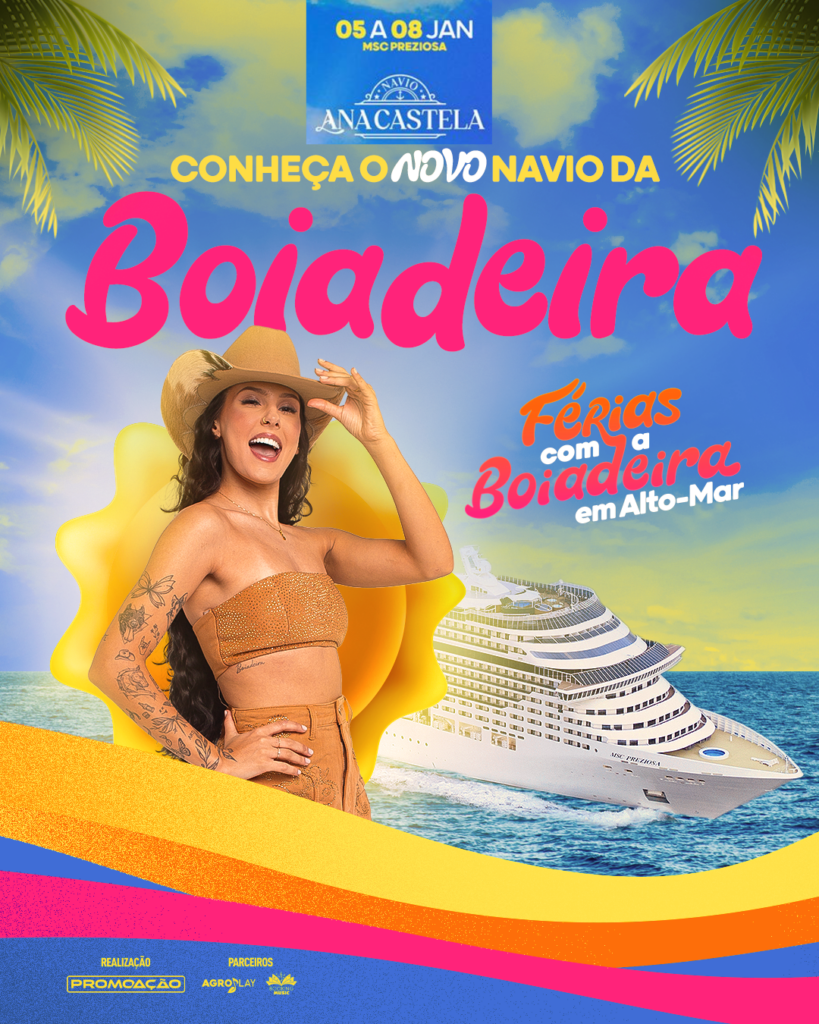A boiadeira mais amada do Brasil, depois do sucesso da primeira edição do seu navio, volta novamente para a segunda edição do seu navio, agora Navio Ana Castela – Férias com a Boiadeira em Alto Mar!