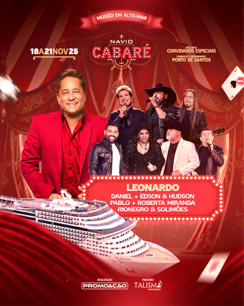 Em sua quarta edição, o Navio Cabaré como sempre esse vem com muito modão sertanejo e convidados especiais: Daniel, Edson & Hudson, Pablo, Roberta Miranda, Rionegro & Solimões.
